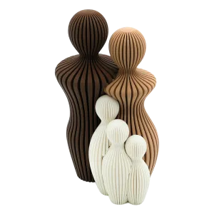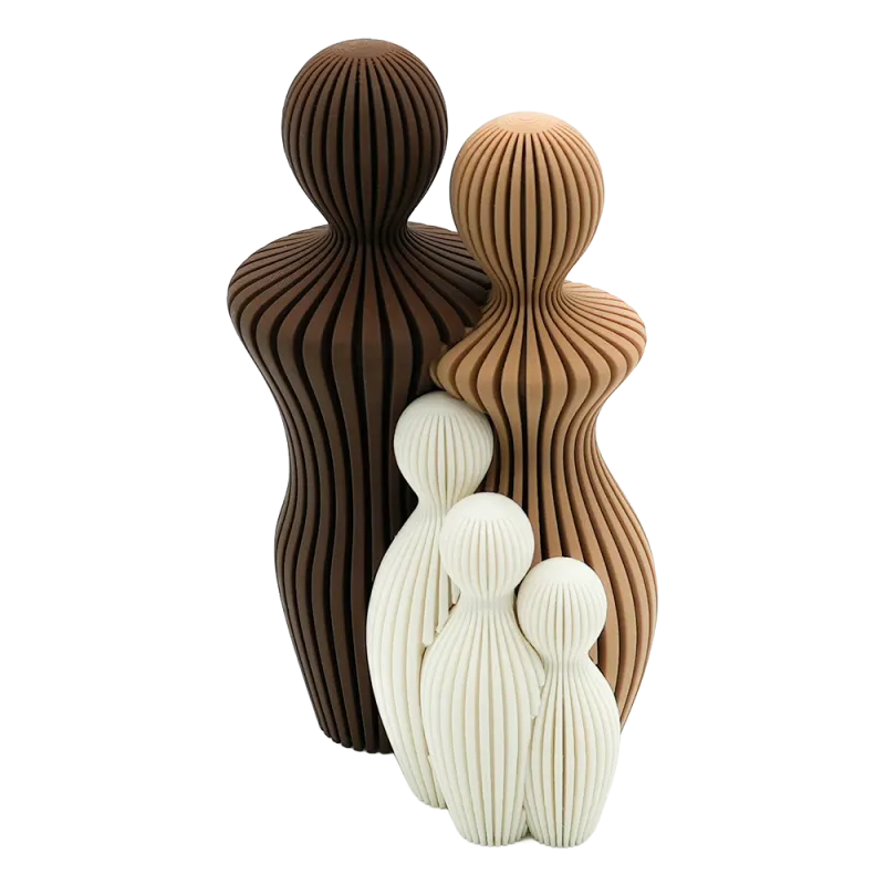 Deze familie beeldjes brengen warmte en persoonlijkheid in je huis. Ze hebben een modern uiterlijk door de strakke lijnen en een geribbelde textuur. Door de ronde vormen, maken ze elk poppetje speels en uniek. De familie beeldjes zijn 3D-geprint en gemaakt van duurzaam materiaal, met aandacht voor elk detail. Ze zijn stevig ontworpen en gaan lang mee. Perfect om je plank, kast of dressoir een moderne styling te geven, of als warm cadeautje voor een housewarming of verjaardag.