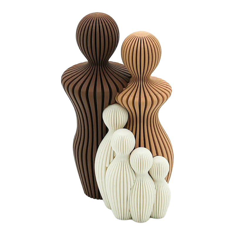 Deze familie beeldjes brengen warmte en persoonlijkheid in je huis. Ze hebben een modern uiterlijk door de strakke lijnen en een geribbelde textuur. Door de ronde vormen, maken ze elk poppetje speels en uniek. De familie beeldjes zijn 3D-geprint en gemaakt van duurzaam materiaal, met aandacht voor elk detail. Ze zijn stevig ontworpen en gaan lang mee. Perfect om je plank, kast of dressoir een moderne styling te geven, of als warm cadeautje voor een housewarming of verjaardag.